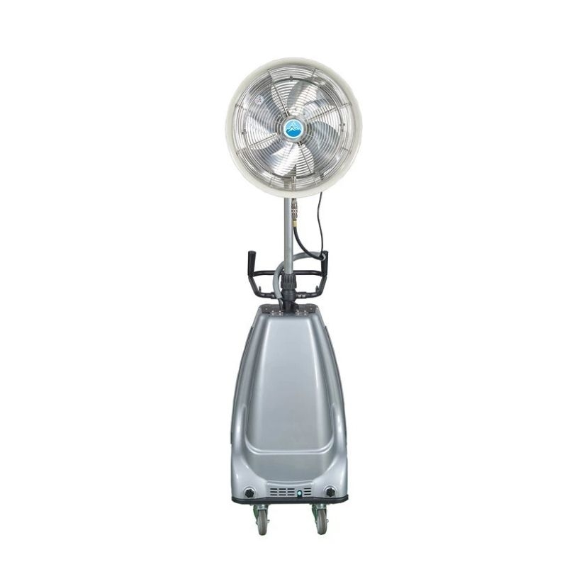 Ventilador portátil con sistema de nebulización (brisa o misting) de alta presión, 18 pulgadas de diámetro y 3 velocidades que le brindan el máximo funcionamiento es amplios espacios., color gris con blanco. Transpórtalo a cualquier espacio gracias a sus ruedas para fácil movimiento.