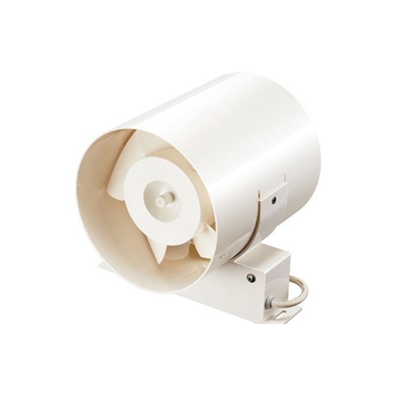 Extractor de aire axial marca estevez para instalación oculto dentro de falso plafón con ductos de 4 con descarga en espacios contiguos. Cuerpo de plástico color blanco que se adapta al diseño del espacio, instalación y uso en interiores.