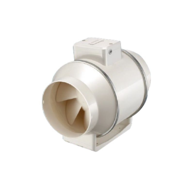Extractor de Aire In Line Blower Centrífugo Colgante para instalación oculto dentro de falso plafón con ductos de 4 con capacidad de extracción para varios espacios. Cuerpo de plástico color blanco, uso interior.