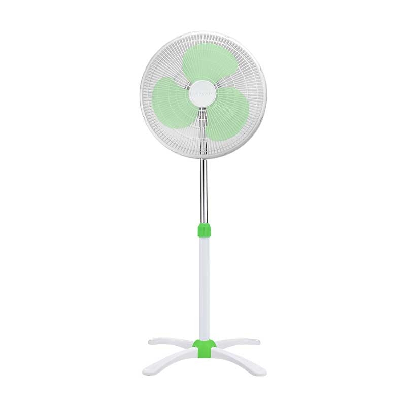 Ventilador de pedestal de alta velocidad, tiene el tamaño ideal para refrescar estancias medias de manera efectiva y duradera. Su diseño en color blanco con detalles en color verde lo hace de idea natural y simple.